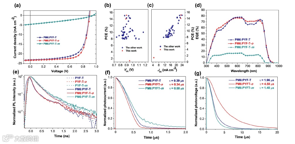 图4. (a) 伏安特性曲线;(b-c) 能量转换效率-开路电压以及能量转换效率-短路电流曲线对应效率大于8%的all-PSC;(d) 外量子效率谱;(e) 时间分辨光致发光谱;(f) 瞬态光电流谱;(f) 瞬态光电压谱。