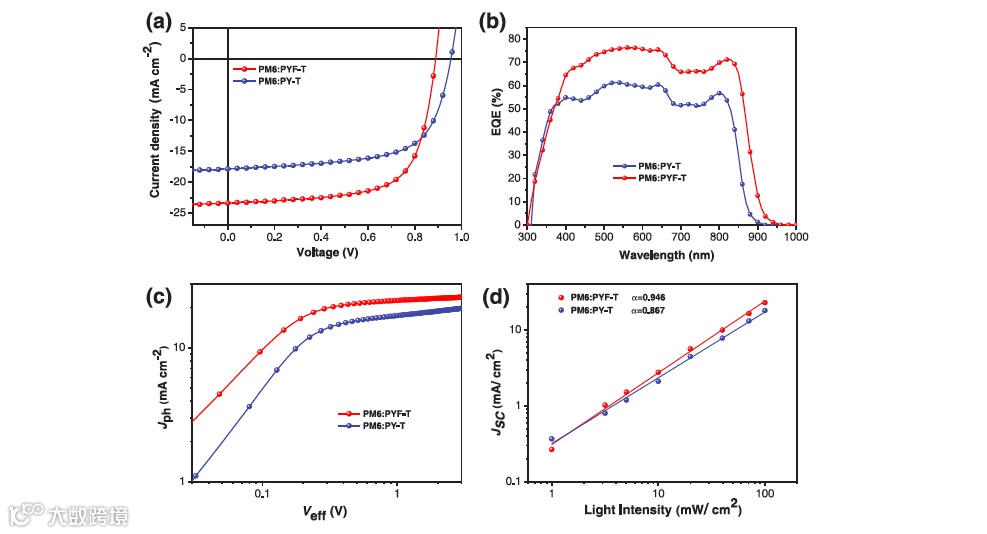研究发现,与非氟化合物PY-T相比,PYF-T具有更强且红移的吸收光谱,更强的分子堆积和更高的电子迁移率。同时,PYF-T端基上的氟化使其能级下降,与给体PM6的匹配度更高,使得电荷转移效率高,电压损失小。因此,PM6:PYF-T的器件效率(PCE)为14.1%,高于PM6:PY-T的11.1%,为当时报道的all-PSC中的最高值之一。这项工作证明了端基氟化在设计高性能聚合物受体方面的有效性,增强分子内电荷转移拓宽光谱吸收,同时氟原子诱导的超分子相互作用增强了分子之间的排列从而有利于电荷传输,这为开发更高效和稳定的all-PSC提供了指导思路。