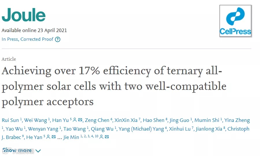 Sun et al. Achieving over 17% efficiency of ternary all-polymer solar cells with two well-compatible polymer acceptors, Joule, 2021, In press (DOI: 10.1016/j.joule.2021.04.007)