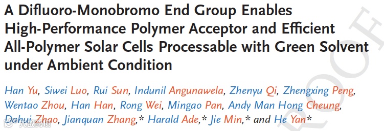 Advanced Function Material:二氟单溴端基片段修饰聚合物受体助力全聚合物太阳能电池,在空气加工+绿色溶剂加工条件下依然具备高效率以及超高稳定性。