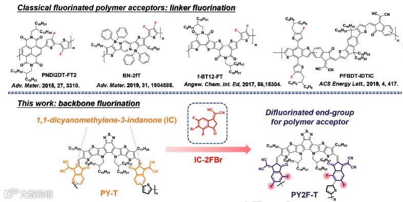 图5. 过往经典的聚合物受体氟化策略:连接基元氟化;文章涉及到的PY-T、IC-2FBr、PY2F-T的化学结构