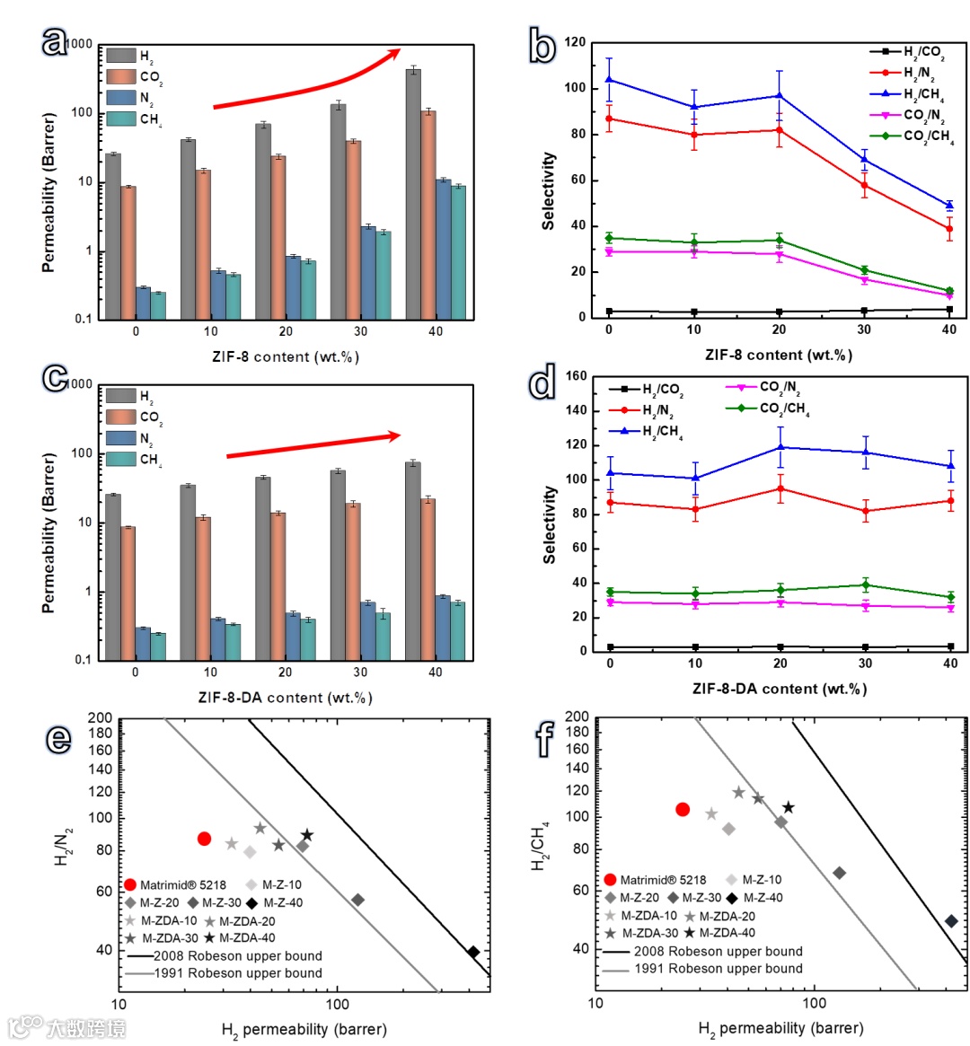 由于ZIF-8-DA具有良好的单分散结构和表面装饰,所制备的ZIF-8-DA/Matrimid纳米复合材料在气体选择性和渗透性方面同时表现出了改善,打破了传统聚合物膜渗透性和选择性之间的传统“此消彼长”效应。
