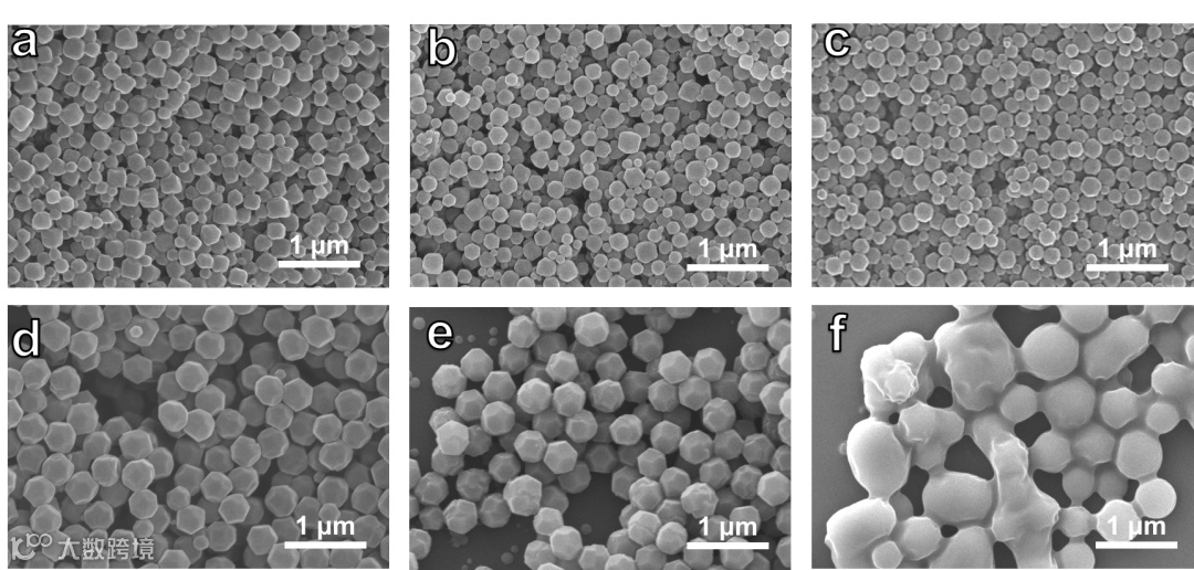 图3 不同多巴胺浓度调节的ZIF-8扫描电子显微镜图,(a) 0 mg/mL (b) 0.5 mg/mL (c) 1.0 mg/mL (d) 2.0 mg/mL (e) 3.0 mg/mL (f) 4.0 mg/mL.