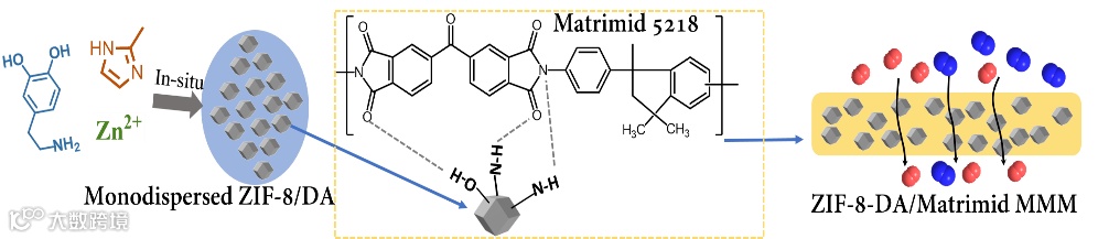 混合基质膜被认为是最具有发展前景的气体分离膜之一。ZIF-8作为金属有机框架(MOF)材料的代表,被广泛应用于混合基质膜填料。近日,哈尔滨工业大学教授、英国皇家化学会会士、城市水资源与水环境国家重点实验室成员邵路教授团队,巧妙的引入多巴胺,在室温下,在水溶液中一步合成单分散的ZIF-8(ZIF-8-DA)。