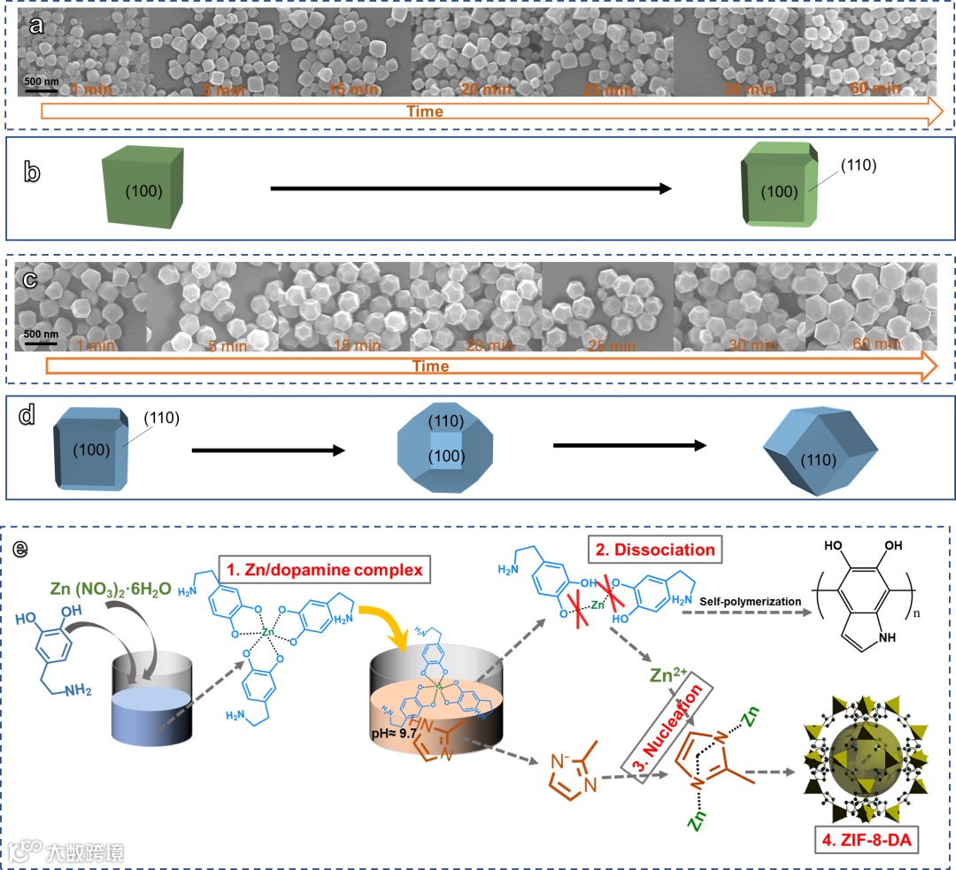图2 多巴胺调节ZIF-8成核机理研究,(a, b)ZIF-8,(c, d)ZIF-8-DA