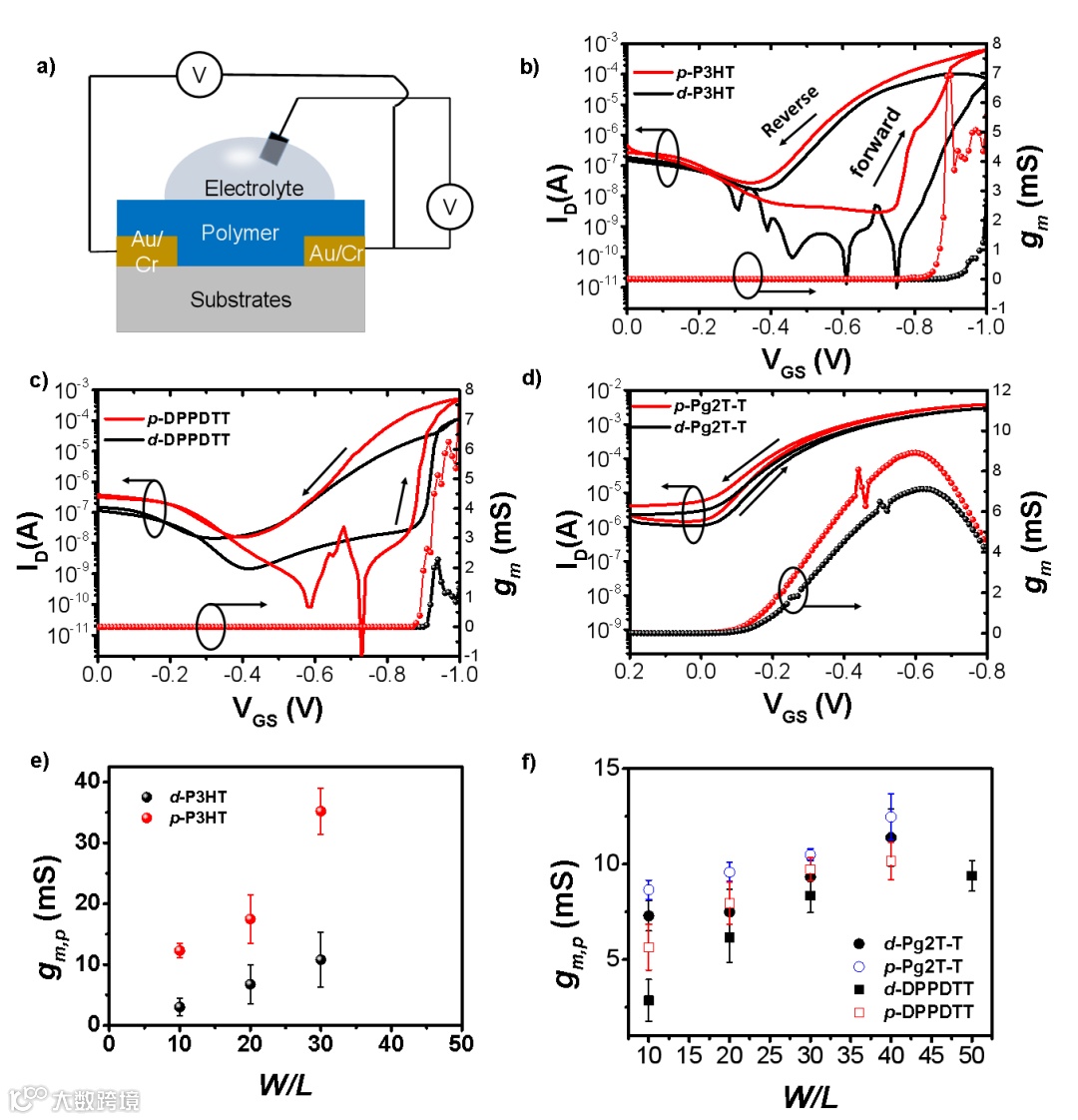 有机聚合物电化学晶体管(OECT)因其高跨导、低驱动电压、水溶液环境兼容的特点在生物/柔性电子学领域展现出广泛的应用前景。有机电化学晶体管通过引入电解质层取代传统的绝缘层,利用离子掺杂活性层薄膜实现对有机半导体薄膜载流子浓度的调控,从而可以在较低驱动电压下获得较高电流。然而高性能的电化学晶体管需要同时平衡氧化还原化学、薄膜中电子输运以及离子渗透与传输。其中离子的渗透和输运对于目前大部分高迁移率共轭聚合物都是一个主要问题。因为从传统场效应晶体管开发的聚合物多是疏水的,不利于水溶性溶液中离子的注入,进而限制了其电化学晶体管的性能。
