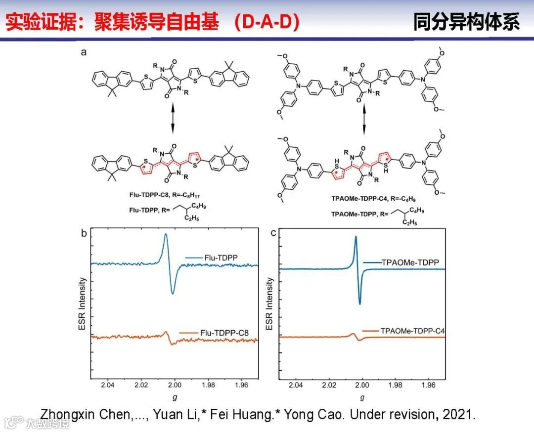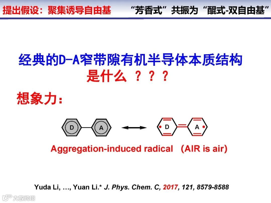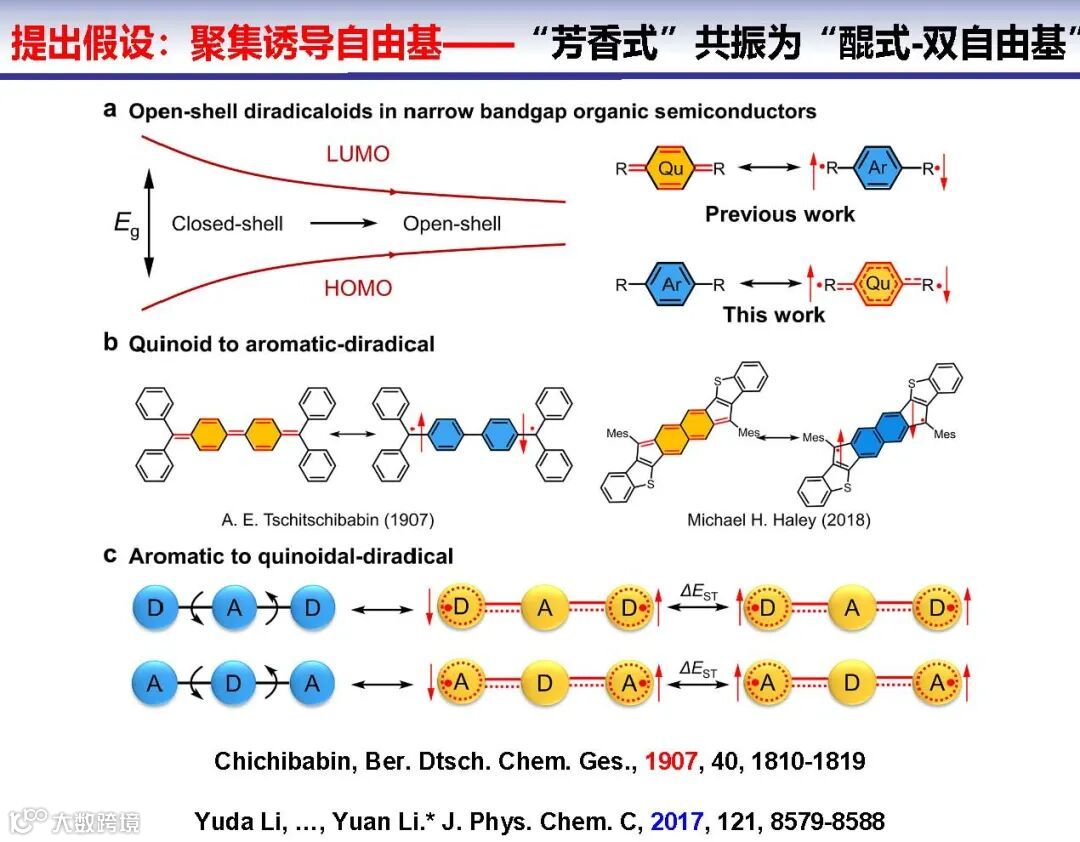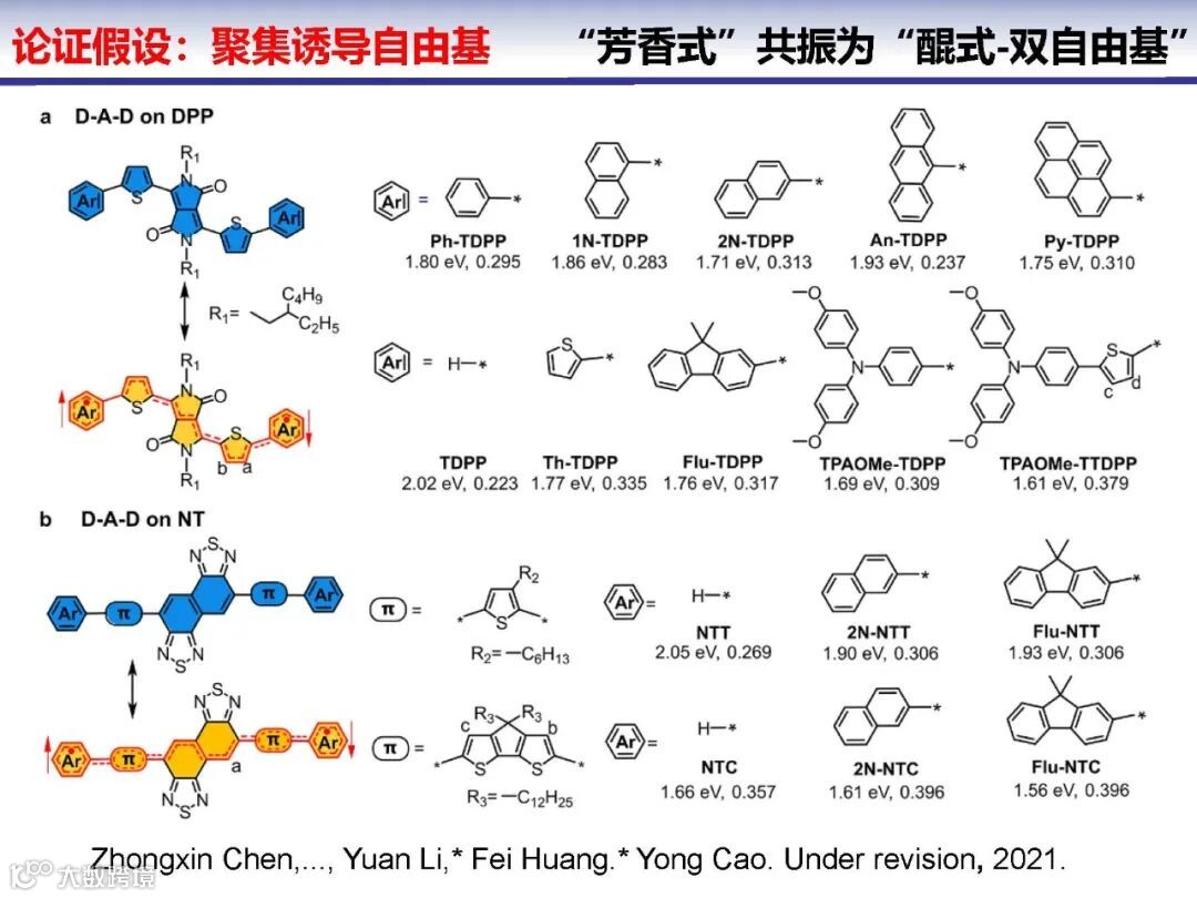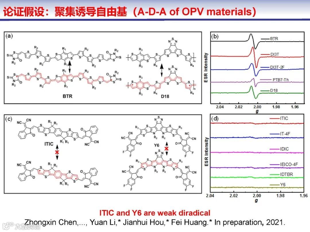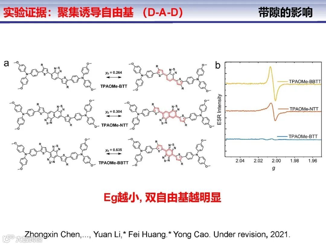 “聚集诱导自由基”(AIR),这一新概念为理解“窄带隙给体-受体有机半导体”的结构-性能关系提供了一个新的视角,对理解有机半导体的基态和激发态过程,以及光/电/磁/热/声的相互作用和转换机制具有重要基础研究意义。
