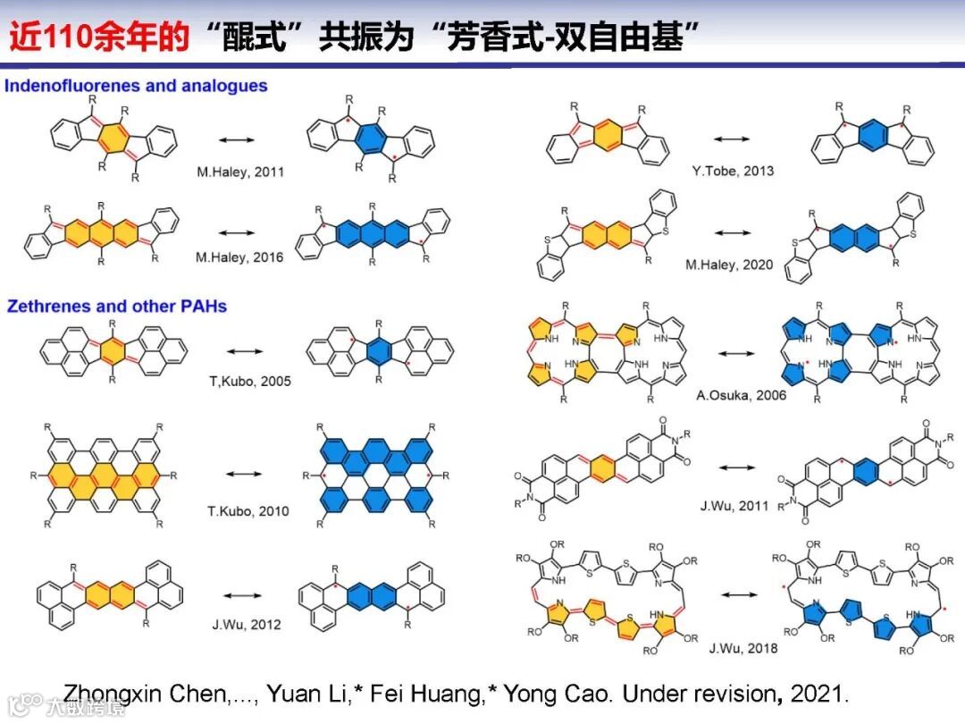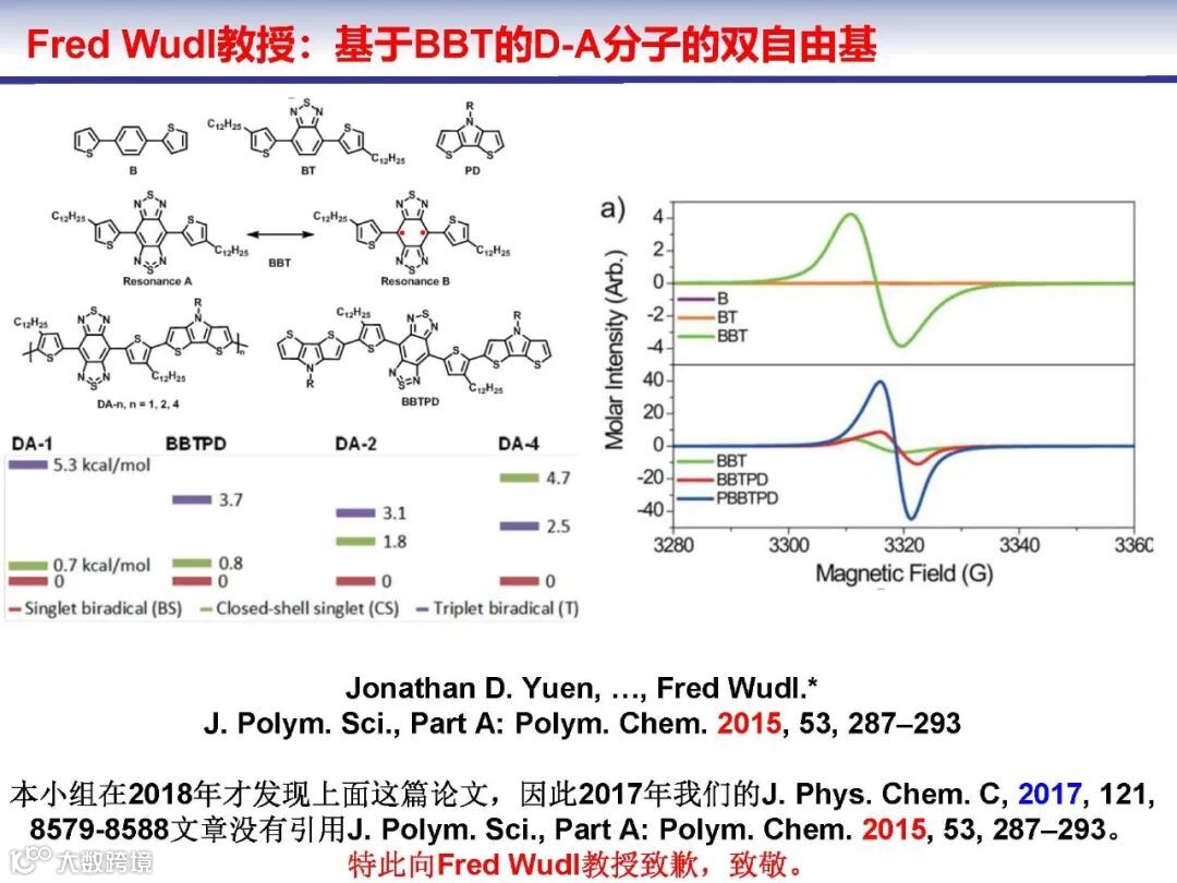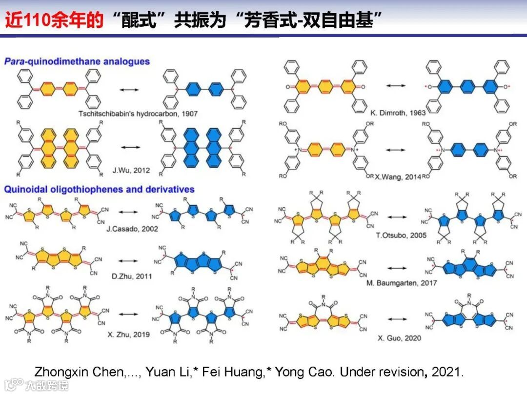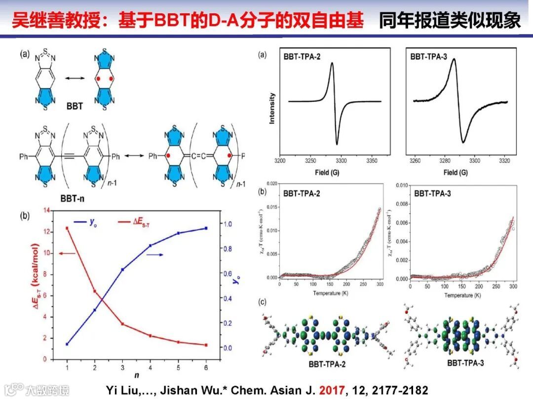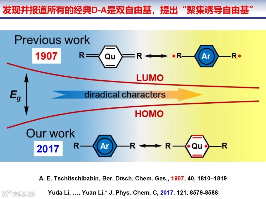 区别于以上被研究了110多年的Chichibabin双自由基、稠环芳烃自由基以及三苯甲烷单自由基,李远博士研究小组首次发现并报道了“窄带隙给体-受体有机半导体”中普遍存在本征的“醌式-双自由基”。