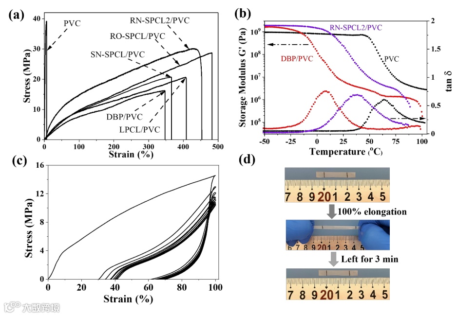 图2. PVC和PVC基弹性体的应力-应变曲线和动态力学分析,RN-SPCL2/PVC塑料十次循环应力-应变曲线和可恢复性图片