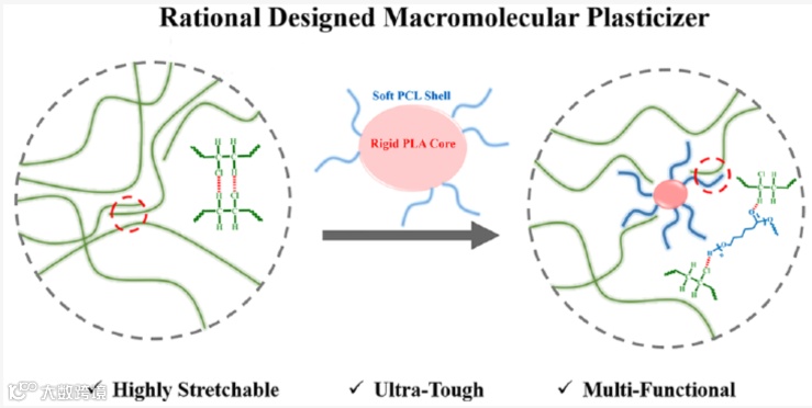 赋予传统“玻璃态”聚合物高度可伸缩性以及超韧性,将为获得物美价廉的高性能弹性体带来更多机遇。聚氯乙烯(PVC)具有优异的耐热型和耐化学性,良好的电绝缘性能和机械性能。优良的性能以及便宜的价格使其成为世界上使用最广泛的塑料之一。目前,用于增塑PVC塑料的小分子邻苯二甲酸酯类增塑剂市场占有率超过80%。但是,该类增塑剂毒性较高,在PVC基体中易迁移、挥发,进而损害增塑剂PVC的力学性能。众所周知,材料的强度和韧性是其应用的先决条件,两个属性通常在材料制备上存在冲突,以往报道的大分子添加剂虽然有着较好的抗迁移能力,但是增塑后的材料力学强度均有很大损失。如何简单有效地设计大分子的结构来赋予聚氯乙烯塑料高强度和超韧性的力学性能仍然是一大挑战。
