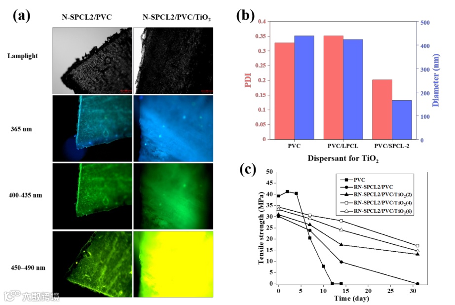 针对以上问题,天津大学陈宇教授&美国橡树岭国家实验室 (ORNL) 曹鹏飞研究员团队通过绿色可降解含氮支化聚乳酸 (N-BPLA) 引发e-己内酯 (CL) 开环聚合成功合成了一系列具有刚性核和柔性壳的星状聚己内酯 (RN-SPCLs)(见图1)。基于聚己内酯 (PCL) 的增塑剂具有出色的可生物降解性、与 PVC 高度混溶性、良好的链柔韧性和潜在的生物来源合成能力,非常适合作为 PVC的“绿色”增塑剂。该团队所制备的新型RN-SPCL增塑的PVC塑料不仅表现出很好的拉伸性能 (453%),而且保持了纯PVC材料力学强度的 80% (30.1MPa),远高于之前的研究报道(见图2)。此外,由于RN-SPCLs含有氨基的刚性核与TiO2 纳米粒子的相互作用,TiO2能够在PVC基体中均匀分散,并且赋予PVC基体光致发光的能力,这极大的增强了PVC紫外耐受性(见图3)。