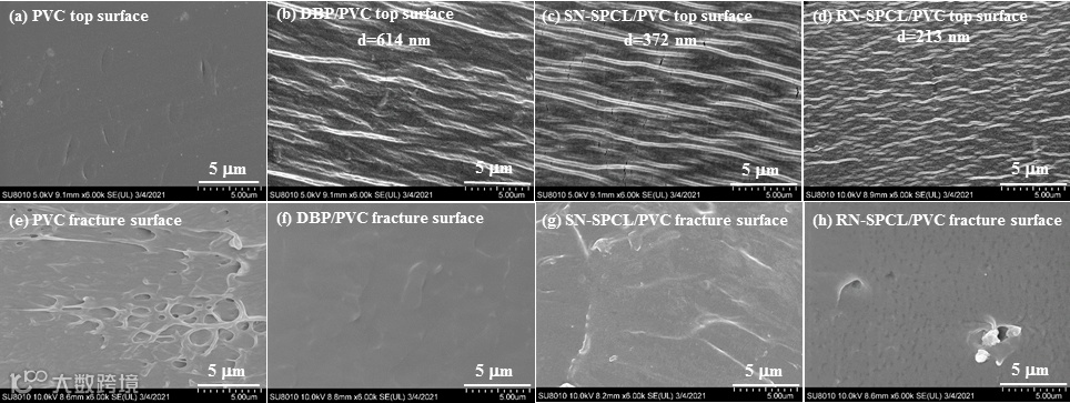 为了验证上述“结构和性能”的关系,该团队首先提出相对刚性的“核”在增强力学性能中所起到的关键作用。在本文中,作者设计了另外两种高分子核,分别是与 N-BPLA刚性相当的 O-BPLA (Tg=35.0℃) 和柔性的N-BPCL (Tg =-57.5℃),由其制备的SPCL分别为RO-SPCL和SN-SPCL。图 2(a)(c) 均表明刚性核具有更强的能量耗散能力,进而能够增强 PVC。为了进一步研究其增强增韧的机理,作者通过扫描电镜 (SEM) 观察了 PVCs 的断裂形貌。图 4(a-d) 表明在所有塑化 PVC 断裂部位的截面都能清晰地观察到大量纤维的形成,但在纯 PVC塑料中没有出现这种现象,这意味着增塑剂抑制了极性 C-Cl 键之间的强相互作用(见图1b),并将大块 PVC 分解成束状的纤维。而 RN-SPCL2/PVC 出现较细的纤维说明其与 PVC 存在更好的相容性。由图 4(h) 可以看出 RN-SPCL2/PVC 在形变过程中存在大量的纳米空腔,表明塑料变形过程中也普遍存在空洞化机制(cavitation mechanism)。通过 SEM 图可以推断,在单轴拉伸变形过程中形成的纤维,纳米空洞生长有助于形成高拉伸性和超韧性的PVC塑料弹性体。最后,该团队提出PVC 塑料的高拉伸性和超韧性应归因于 RN-SPCL 独特的“核壳结构”:具有相对刚性的 N-BPLA 核和许多柔性 PCL 臂。RN-SPCL中的许多柔性 PCL 臂可通过抑制极性 C-Cl 键之间的强相互作用来有效地与 PVC 相互作用(见图1b)。RN-SPCL中的许多柔性 PCL 臂可以耗散外力的能量。同时,相对刚性的N-BPLA(Tg=28.0℃)核不仅扮演着像其它增塑剂一样增强复合材料强度的角色,还可作为外在增韧剂,在裂纹/空洞上就地“桥接”,从而抵抗裂纹的增长。