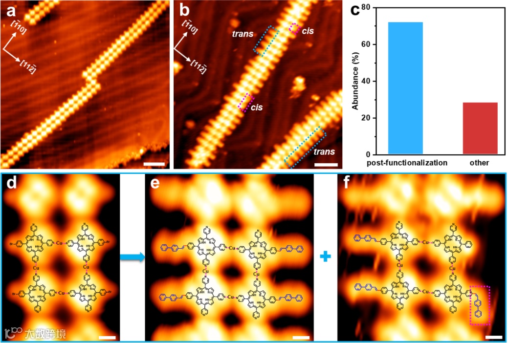 首先,作者通过表面Heck偶联反应,实现了梯形的Cu-配位超分子聚合物的后官能化,得到了梯形结构保持且边缘联苯乙烯官能化的Cu-配位超分子聚合物。