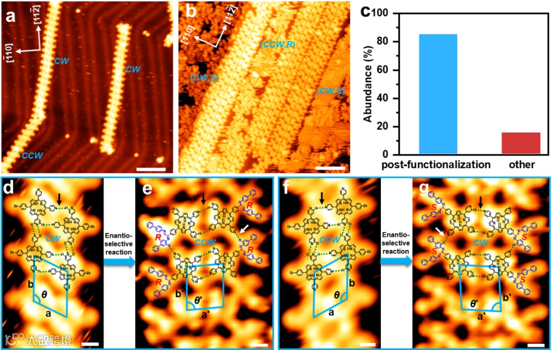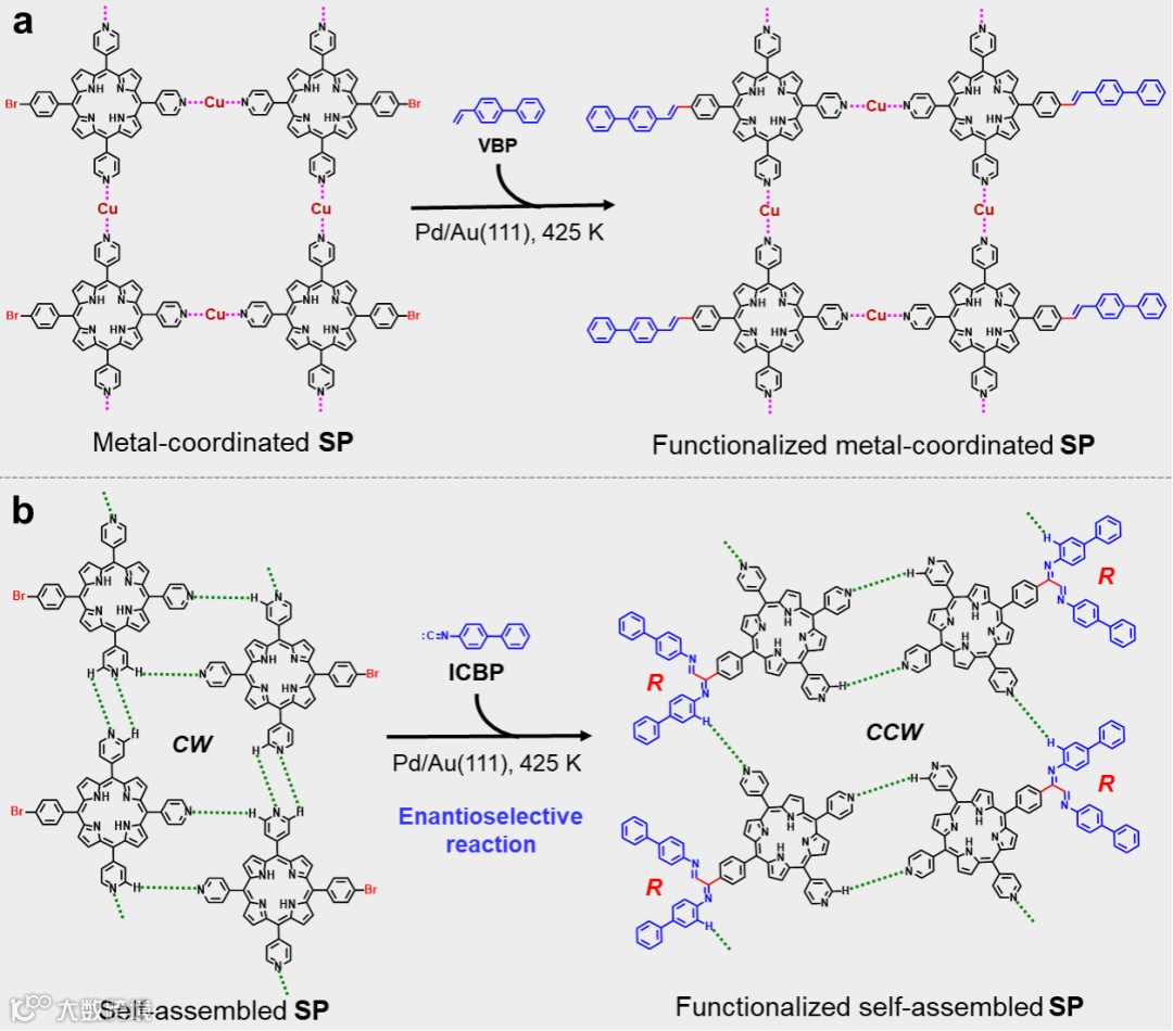在该研究工作中,所发展的表面后官能化方法为通过表面合成构建新型纳米结构提供了新的途径,并且手性组装诱导对映选择性反应的发现将有助于指导对表面对映选择性反应的探索。