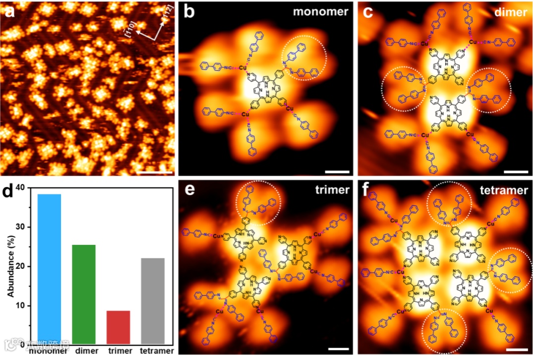 接下来,利用发散型交叉偶联反应,对Cu-配位超分子聚合物进行后官能化,结果发现超分子聚合物的梯形结构分解,生成外围环绕联苯异腈并以卟啉单体、二聚体、三聚体和四聚体为核的低聚物。控制实验说明联苯异腈诱导了Cu-配位超分子聚合物的分解。进一步的理论计算揭示联苯异腈分解Cu-配位超分子聚合物梯形结构的本质是因为异腈-Cu-吡啶配位结构比吡啶-Cu-吡啶更稳定。