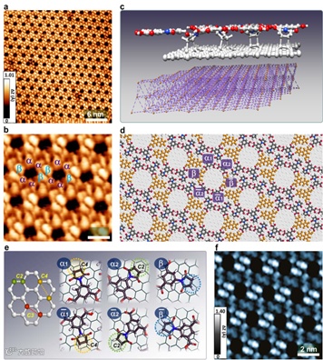 图2分子网络与石墨烯环加成反应后的扫描隧道显微镜图和理论模型