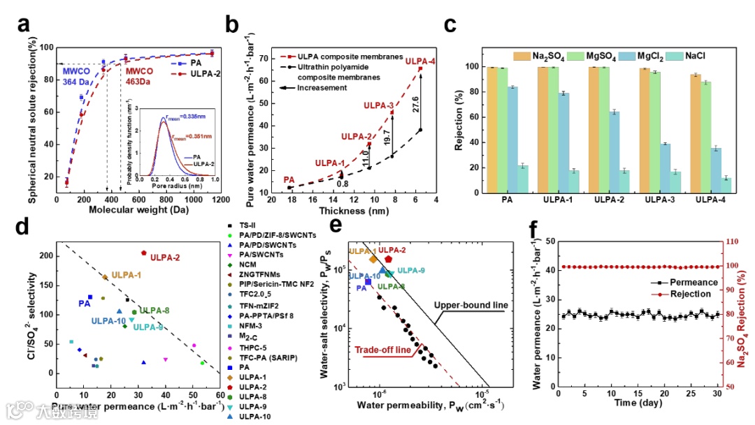 图2. a) ULPA复合膜的截留分子量,插图:平均孔径和孔径分布;b) ULPA复合膜的纯水通量随膜厚度的变化;c) GQD浓度对ULPA复合膜盐截留的影响;d) ULPA复合膜的Cl-/SO42-选择性;e) ULPA复合膜的水渗透性和水盐选择;f) ULPA复合膜30天运行的稳定性