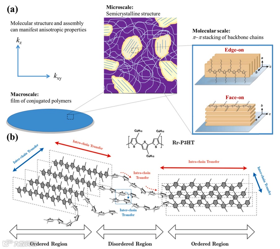 该论文不仅包括有机共轭高分子在宏观尺度、微观尺度以及分子尺度上的多层次取向结构(既包括长程的晶区和分子链取向,也包括短程的晶面和构象取向),而且涵盖了不同层次取向结构与有机共轭高分子的热电性能的关系研究(包括热电性能的各向异性与性能优化等)。作者首先介绍了实现取向结构的加工方法,并评述了不同加工方法的特点。进而,进一步讨论了不同尺度微结构对热电参数的影响,及其背后的电子和声子传输机理。最后,展望了该领域的挑战和发展趋势,认为将来需要在发展新的取向加工技术、解决薄膜面内导热系数精确测量和提出针对有机热电材料结构特点的通用化传输理论模型等方面开展进一步深入研究。