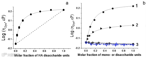 图2. HA-PEG混合物的动态黏度。(a)PEG + HA 350 kDa;(b)1) Pluronic F68 + HA 350 kDa,2) PEG + HA 108 kDa,3) PEG + N-乙酰基-D-葡萄糖胺(蓝色三角形)或D-葡萄糖醛酸(蓝色倒三角形)或D-葡萄糖(圆圈)。