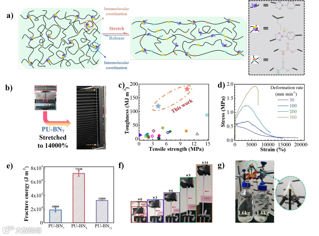 针对这一难题,合肥工业大学化学与化工学院方华高副教授和丁运生教授等通过分子设计,将硼酸酯与可形成配位的含氮电子给体同时引入聚氨酯主链,制备出一种基于动态硼酸酯和硼-氮(B-N)配位作用的超分子聚氨酯弹性体材料(图1a)。扩链剂小分子DFT计算结果显示所采用的硼酸酯与叔胺扩链剂之间可形成B-N1和B-N2两种配位作用,其中以B-N1型为主(图1b)。核磁11B谱证实聚氨酯体系中硼原子均已形成B-N配位键(图1c),致使弹性体的储能模量显著提高,并抑制了分子链的松弛(图1d)。B-N配位键在聚氨酯弹性体中构筑了分子内与分子间超分子作用(图2a):分子内B-N配位促进了聚合物链的折叠,赋予材料超高的延展性(断裂应变: 14000%)(图2b);分子间B-N配位作为物理交联点,显著提高了材料的力学强度(10.5 MPa),其拉伸韧性达到182.2 MJ m-3(图2c),远高于目前已报道的其他室温自修复材料。由于B-N配位具有动态特性,在体系中形成瞬时网络结构,单轴拉伸性能表现出显著的速度依赖性(图2d)。此外,在弹性体撕裂过程中,通过B-N配位作用的可逆断裂与重组,有效吸收外界能量,断裂能高达72100 J m-2(图2e),表现出优异的缺口不敏感性(图2f,视频1)和突出的抗穿刺特性(图2g,视频2)。