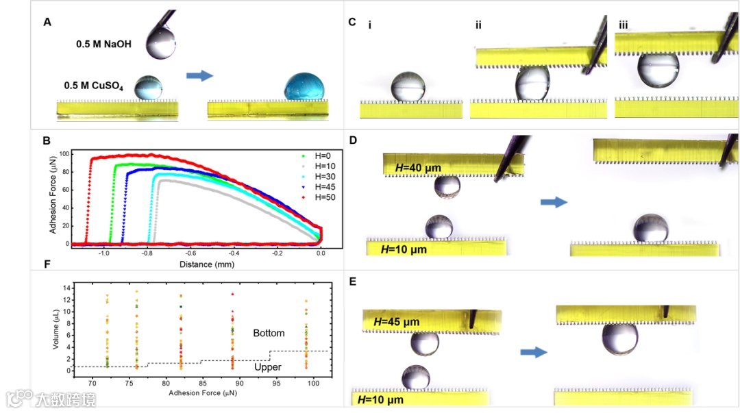 图3. 3D打印制备的超疏水微蘑菇结构应用于(A)微液滴化学反应(C)液滴无损转移(D-F)液滴的可控融合(B)不同结构表面对水滴的粘附力