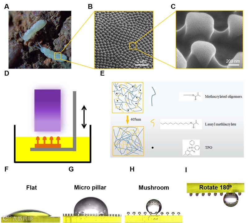 图1 仿生超疏水结构的设计及制备(A-C)弹尾虫光镜图及其表皮结构的扫描电子显微镜图(D-E)面投影微立体光刻3D打印技术原理图(F-H)3D打印平板、圆柱以及微蘑菇结构的的浸润性对比(I)花瓣效应