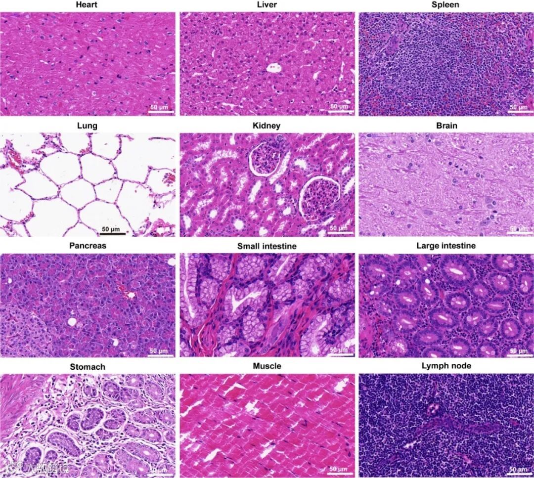 图3 随机选取一只食蟹猴在静脉注射AIE探针35天后主要器官的HE染色成像结果。