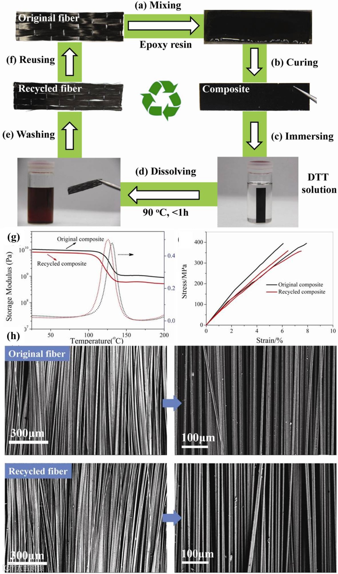 图4环氧vitrimer碳纤维复合材料:(a、b)制备过程;(c、d)拆解过程;(e、f)清洗再用过程;(g)循环利用前后的DMA和拉伸断裂曲线;(h)循环利用前后的纤维形貌图(SEM)。