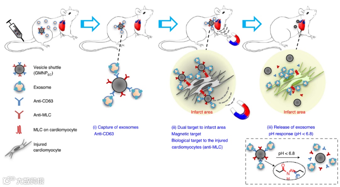 近日,空军军医大学金岩、刘世宇团队和西安交通大学陈鑫团队合作在国际知名学术期刊Nature Biomedical Engineering发表了题为“Treatment of infarcted heart tissue via the capture and local delivery of circulating exosomes through antibody-conjugated magnetic nanoparticles”的研究论文(图1)。该研究通过构建双抗体修饰的pH响应性磁性纳米颗粒,体内操纵外泌体生物学分布并靶向至心肌梗死区域,利用内源性外泌体的治疗作用促进心梗后血管化并提升心功能。该研究首次提出按需操纵内源性外泌体生物学分布的策略,建立了基于细胞外囊泡的疾病治疗新方法。