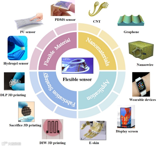 图1. 基于纳米材料的柔性传感器的重要组成部分及其应用领域:柔性基底材料、纳米材料、制备工艺。