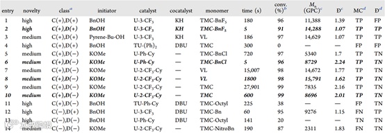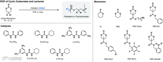 对内酯或环状碳酸酯的开环聚合(ROP)而言,实验条件的选择至关重要。不合适的实验条件将导致实验反应器污染,分子量分布展宽,甚至根本不发生聚合反应。也即,内酯与环状碳酸酯的活性ROP十分依赖单体以及催化剂的种类与活性。即便对这类ROP的热力学与动力学进行了深入的研究,至今为止也无法保证,即没有普适的理论框架能够确保能够为特定反应预测最合适的催化剂。尤其是,即便单体结构只发生了些微的变化,也可能对反应活性产生极大影响。因此,采用统计的方法,根据前人研究的经验进行单体及催化剂条件的设计,所耗费的工作量依然不小。