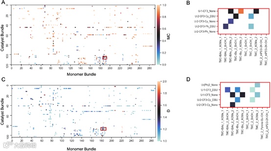 对35k个已有的实验结果进行数据统计分析,绘制以上述双组份,即单体束与催化剂束为横纵坐标,分别与MC及Đ相关的二维热图,如图2所示。对于热图上的每个数据点,若MC或Đ满足筛选要求,则记权重为1,若存在实验结果,但不满足要求,则记数据点权重为0.5。最终观察到的推荐系统对于MC的平均精确度(AP)达到0.65,对Đ的AP达到0.67。