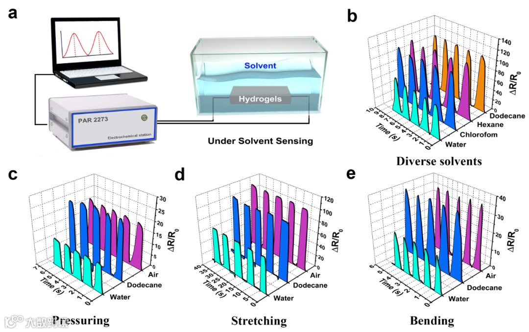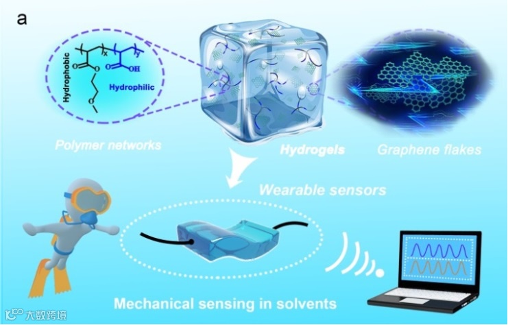 近年来,柔性电子在可穿戴器件、能量存储、电子皮肤等领域得到了广泛的发展,水凝胶材料凭借其优异生物相容性及良好机械柔韧性,展示了无限潜能。然而,由于溶剂分子侵蚀作用,大部分水凝胶材料在水或油等液体环境下无法实现稳定应用。