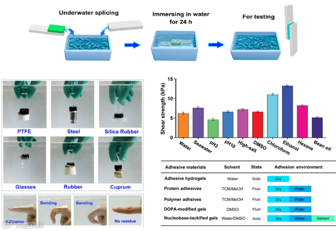 近五年来,该研究团队一直致力于粘韧水凝胶材料的设计及其在医用敷料、柔性传感与能量存储等应用的研究,在《Advanced Functional Materials》、《ACS Nano》、《Chemical Engineer Journal》、《Journal of Materials Chemistry A》等期刊共计发表近80篇SCI研究论文。2017年首次提出核酸碱基增粘水凝胶新策略,实现了5种碱基增粘水凝胶材料及对各种固体基质和生物组织的高强度粘结,包括:金属、塑料、橡胶、硅胶、陶瓷、木头、以及小鼠的心、肝、脾、肺、肾等生物组织(Adv. Funct. Mater. 2017, 1703132)。在此基础之上,研究人员通过合理地设计聚合物的分子体系,成功地赋予了碱基增粘水凝胶材料优异的高强度粘性、抗疲劳粘性、水下粘性、以及各种溶剂环境下的对各种材料的抗溶剂粘性(Adv. Funct. Mater. 2019, 1900450; ACS Appl. Mater. Interfaces 2017, 9, 17645; Polym. Chem., 2018, 9, 4535; ACS Appl. Mater. Interfaces 2019, 11, 6644)。为了进一步拓展研究体系,该研究团队将核苷酸、氨基酸、蛋白质、多糖等系列分子引入到水凝胶材料中,成功地赋予其优异的粘韧性能(J. Mater. Chem. A, 2020, 8, 9373; Chem. Eng. J. 2020, 398, 125555; Chem. Eng. J. 2019, 375, 121915; Chem. Mater. 2019, 31, 5881; ACS Appl. Mater. Interfaces 2019, 11, 25613)。