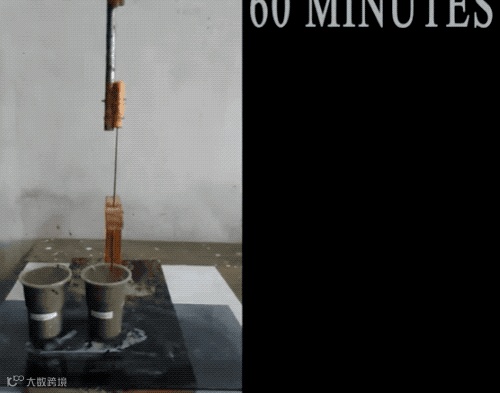 你可以清楚地看到,加入了糖以后,右边的水泥过了60分钟也没有变硬,而左边没有加糖的水泥已经硬化了,检测用的金属棍无法扎入——