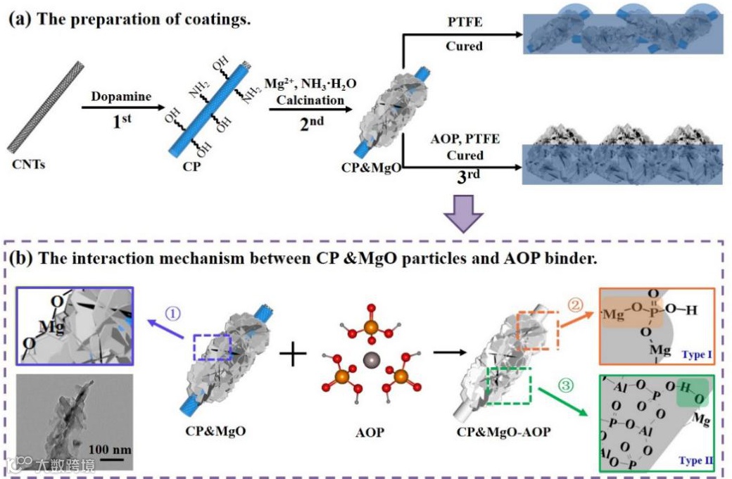 该团队以聚四氟乙烯乳液(PTFE)作为水性树脂,多壁碳纳米管上原位生长氧化镁(CP&MgO)作为复合填料,磷酸二氢铝(AOP)作为无机粘结剂。在复合填料与无机粘结剂间发生的氢键作用和交联作用下,形成的磷酸盐网络包裹在复合填料表面,这不仅增强了复合填料间的界面相互作用,而且增强了涂层与基板之间的界面结合力。