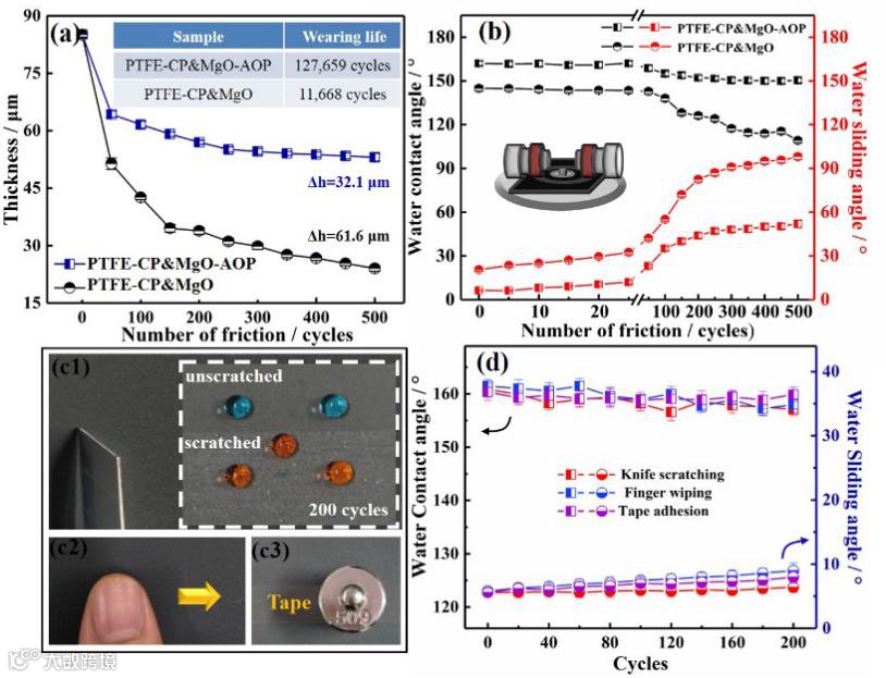 图2. 采用滚动摩擦法研究了PTFE-CP&MgO涂层和PTFE-CP&MgO- AOP涂层厚度、WCAs和WSAs随摩擦周期的变化。注:涂层的磨损寿命为基材暴露时的摩擦周期。对PTFE-CP&MgO-AOP涂层表面各种机械损伤的实验研究:(c1) 50 g重量下的刀痕试验、(c2) 手指擦试验和(c3) 胶带粘接试验;(d) 涂层表面润湿性随磨损次数的增加而变化。