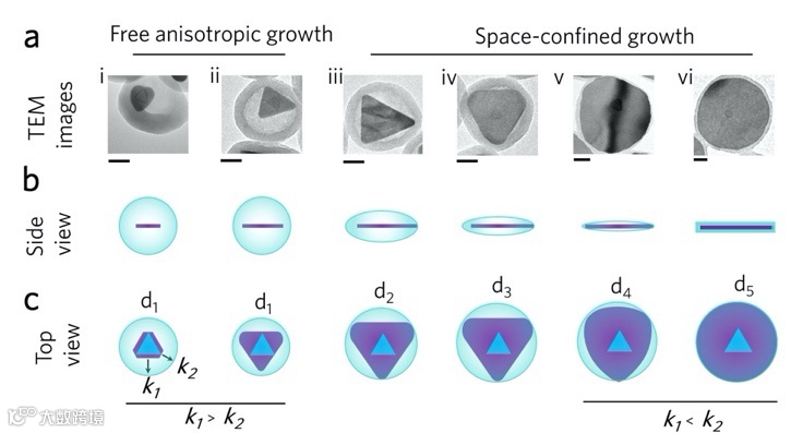 图1. 银纳米片在可形变聚合物限域空间中的生长过程。a)银纳米片在限域空间中不同生长时间段的形貌。b,c)银纳米片和限域空间形状演变的示意图。
