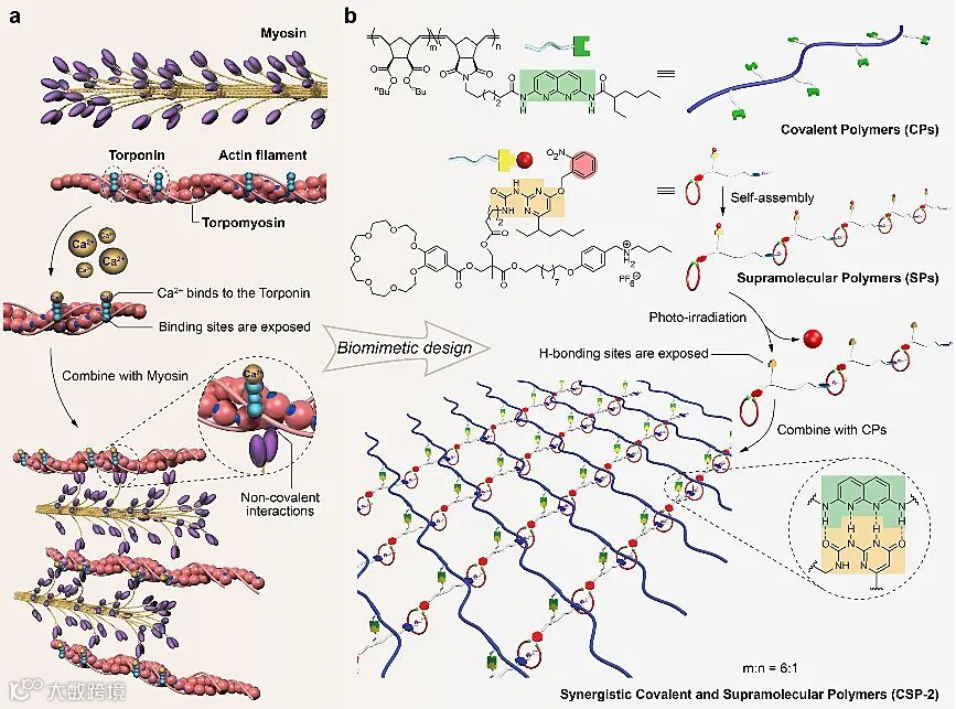 共价聚合物 (Covalent Polymers, CPs) 性质稳定、机械性能优异,但缺乏动态性。与之相反,新兴的超分子聚合物 (Supramolecular Polymers, SPs) 动态性有余而机械性能不足。这些性能限制了这两类聚合物材料在特定领域的应用,尤其是对机械性能和动态性要求均高的场合。在自然界,除了单一的共价或超分子聚合物,还存在两者共同作用的协同的共价-超分子聚合物 (Synergistic Covalent-and-Supramolecular Polymers, CSPs),来实现生命体复杂的生命活动。典型的例子是,在肌肉基本单元肌原纤维中,肌球蛋白 (一类共价聚合物体系CP) 和肌动蛋白丝 (一类超分子聚合物体系SP) 通过协同作用来进行肌肉的收缩活动 (图1)。然而,构筑人工的协同的共价和超分子聚合物来实现特定的性质和功能,目前仍极富挑战。