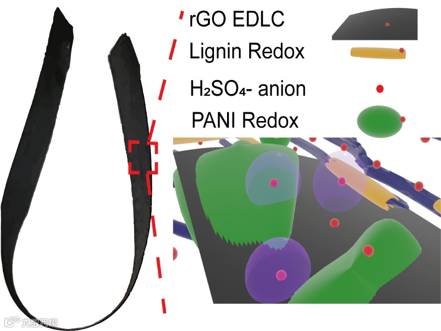 加拿大多伦多大学颜宁教授团队和Keryn Lian教授团队近期开发了一种在含木质素的纳米纤维素 (LCNF)基体上复合还原石墨烯(rGO)和聚苯胺(PANI)的超级电容器柔性电极。成果发表在ChemSusChem并被选为VIP文章。此研究第一次证明,木质纳米纤维素不仅能起到柔性电极的整体支撑作用,提高机械强度与柔性, 还能极大的增强电容储能功能;并且通过对比不含木质素,仅含纳米纤维素的电极参照实验发现,含木质素的纳米纤维素还极大地提高了电极的能量密度。此能量密度的提升可以归功于木质素中富含的醌基(quinonic groups)在氧化还原反应中的活跃性能。用含木质素的纳米纤维素 (LCNF)复合的还原石墨烯提升了电极整体导电性,其聚苯胺更加提高了电极的能量密度。实验表明,优化后的复合电极在1mV/s的扫描速度下提供了733F/g的比电容,优异的功率密度及长循环寿命。复合电极本身的能量密度及功率密度高于诸多在文献中含碳和聚苯胺的柔性电极。基于复合电极而组装的对称柔性薄膜电容器更是展示了在180°弯曲条件下稳定的电容器充放电性能。在文中的一项拓展研究中,应用此复合电极为正极并搭配锌负极而开发的非对称双电解液(dual-pH electrolyte)超电器件实现了在水体系中达到2.3V的有效电芯电压,极大的提升了电芯能量密度。