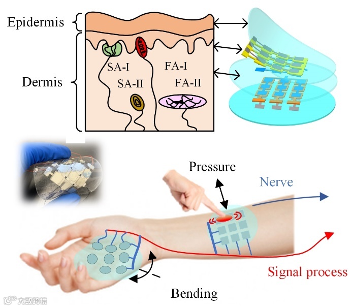 近年来,柔性电子皮肤一直是科研界和工业界的研究热门,其中用于模仿人体皮肤功能的仿生触觉传感器是研究重点。触觉传感器可以对外界的应力刺激产生对应的电信号,广泛应用于人工智能、人机交互、生物信息检测等领域。为了能更好的设计仿生触觉传感器,首先要了解人体皮肤的感知原理。人体皮肤是一种非常了不起的触觉传感器,可以同时检测各种刺激的强度和模式,既其可以分辨按压、敲击和弯曲。这主要归因于四个机械感受器(SA-I,II和FA-I,II)分布在人体皮肤不同区域。机械感受器接收外部刺激并将其转换为电子信号,然后这四种受体的综合信号由大脑进行分析,得到物体大小,形状和质地等信息。目前,柔性触觉传感器阵列在实际应用上面临着许多挑战,首先,目前的触觉传感器阵列往往只有单一功能,即使是可以测量正压力和弯曲的多功能传感器,也无法从传感器信号分析出外界刺激的模式。其次,大面积,高分辨率的传感器阵列需要大量的电极引线,限制了其发展。尽管行+列的布线结构,已经广泛应用于电阻式和电容式传感器阵列中,但是对于压电传感器而言,这样的布线结构会导致信号串扰的问题。因此,具有n × m 个单元的压电传感器阵列,往往需要n × m 条引线, 并且布线结构相当复杂。