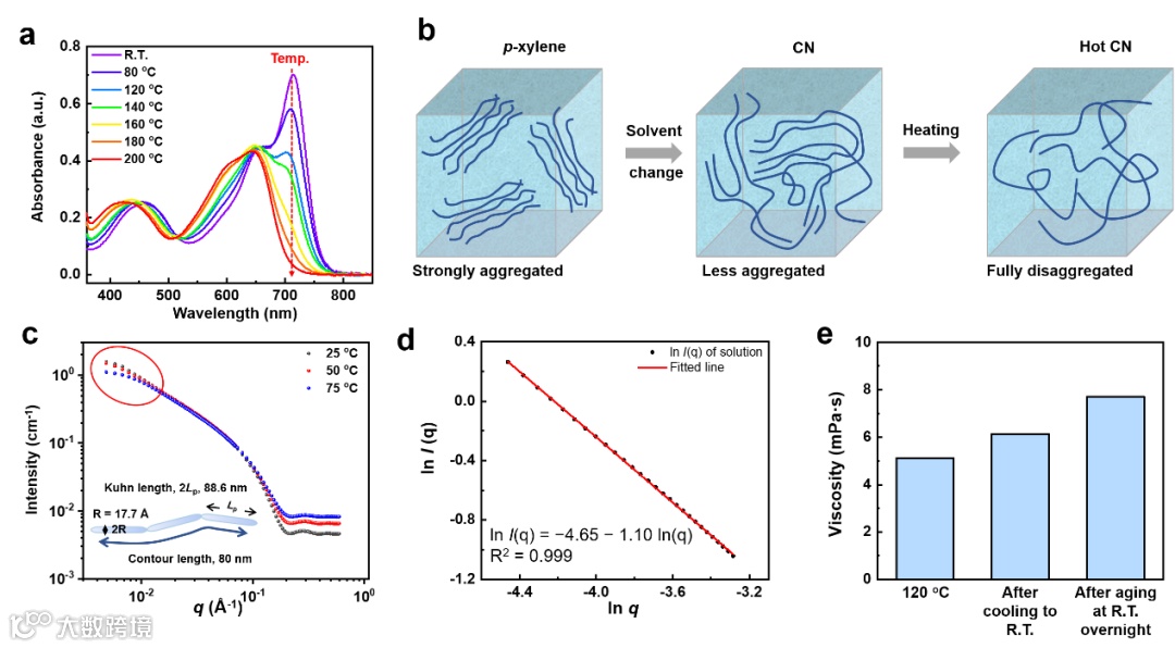 图2. (a) 聚合物P(PzDPP-CT2)在氯萘溶液中的变温吸收光谱;(b) 溶液中聚合物聚集状态随着溶剂和温度变化的示意图;(c) 不同温度下的聚合物溶液态的中子散射图谱;(d) 由75 ℃时聚合物溶液的中子散射数据拟合的Porod曲线图;(e) 聚合物溶液在120 ℃加热,冷却到室温和室温放置过夜过程中的粘度变化。