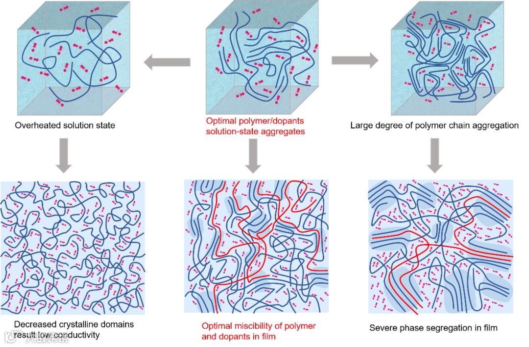 图1. 聚合物和掺杂剂在溶液态中不同的聚集状态及其形成的固态薄膜形貌