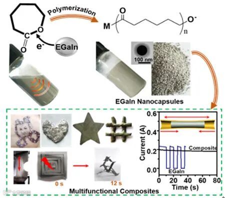 图1. 液态金属引发ε-己内酯开环聚合制备液态金属胶囊粉体及其应用展示。