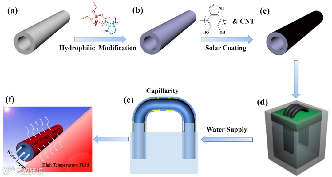 图1. 中空纤维膜的改性工艺:(a)和(b)中空纤维膜的亲水改性;(c)使用PDA和CNT改性中空纤维膜;(d)光热转化装置;(e)改性后的中空纤维膜可依靠毛细力进行汲水;(f)蒸发过程模型图。