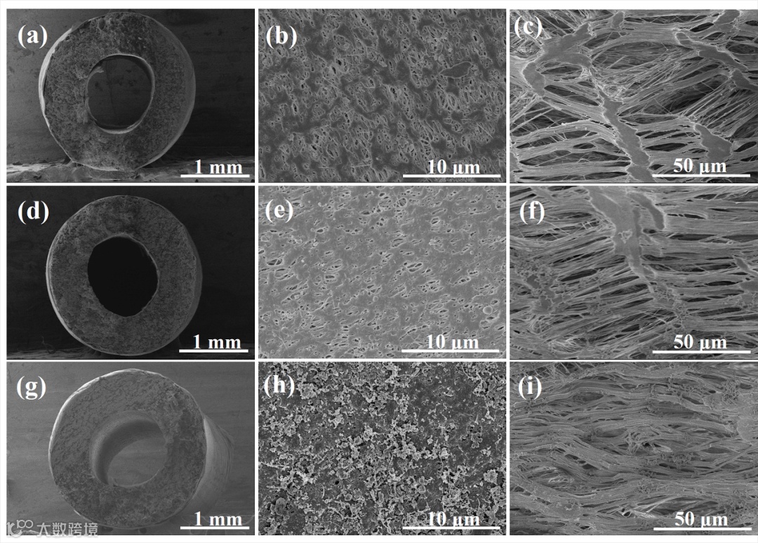 图2. 中空纤维膜的形态:HFO的断面(a)、外表面(b)和内表面(c);HFH的断面(d)、外表面(e)和内表面(f);HFC的断面(g)、外表面(h)和内表面(i)。(g)中的插图代表断面的局部放大SEM图,(h)中的插图为HFC膜表面的低倍率下的SEM图。