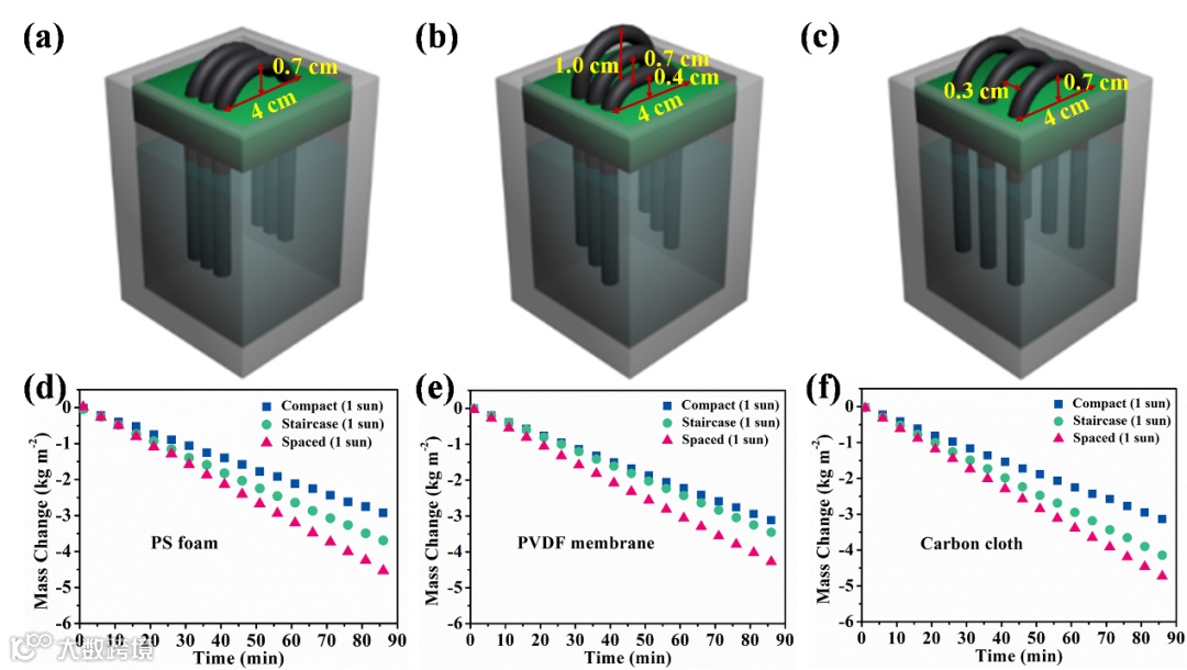 图5. 不同排列方式的示意图:并排排列(a);高低排列(b);间隔排列(c);(d-f)分别以PS泡沫塑料,PVDF膜和碳布作为基底时,不同排列方式下三根中空纤维膜表面水蒸发质量与时间的关系。