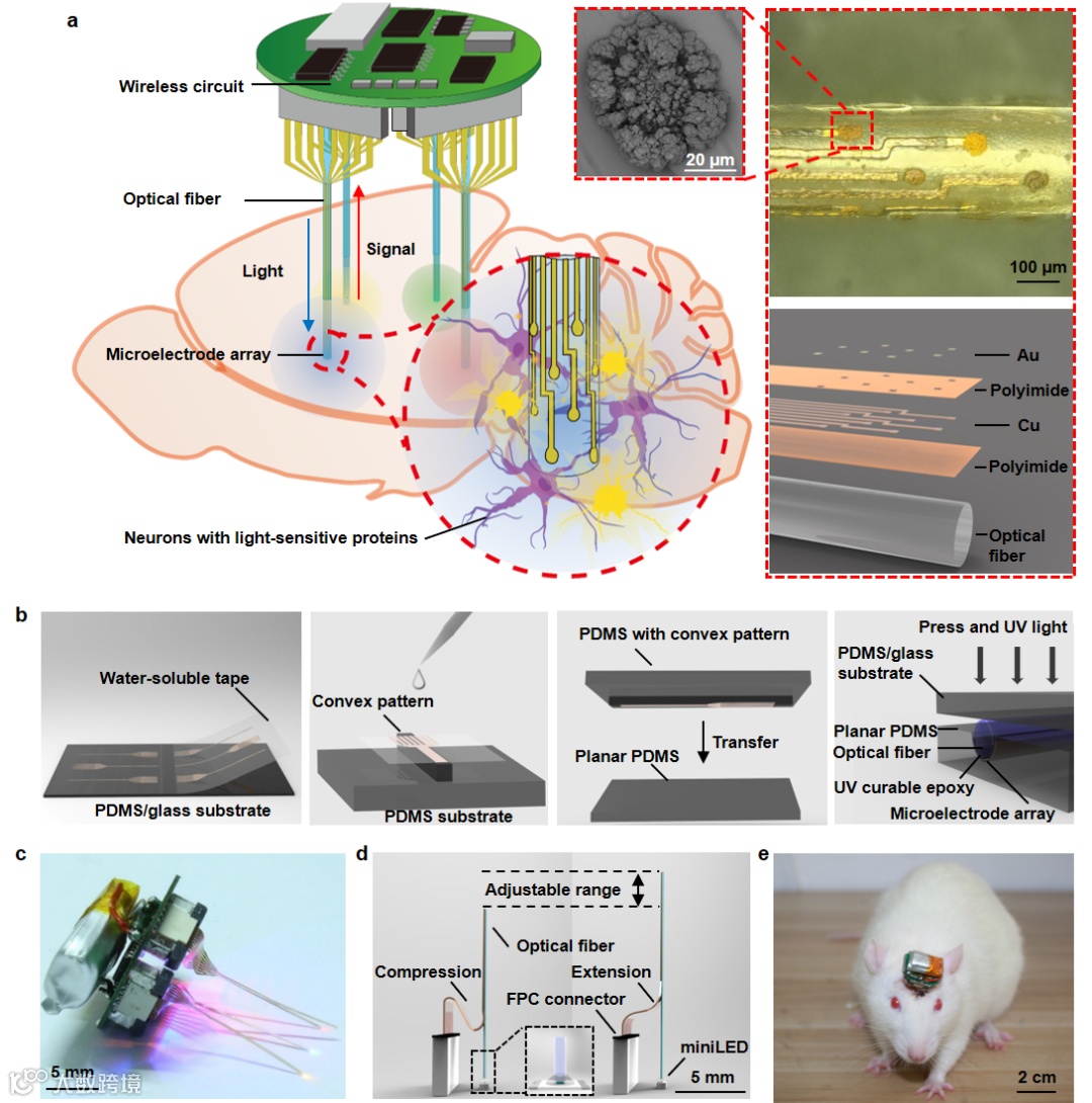 光纤作为一种常见的光导器件,已经被广泛应用于通信、物理化学传感等领域,高效地利用它的表面积或许就能实现更多功能的集成,然而它弯曲的表面使得与其他电子元件的集成极具挑战性。在生物医学领域,相比于分离式的光纤与电极系统,利用光纤自身与光纤表面进行刺激与感测,就能够实现植入物尺寸最小、 对组织的损伤最小。