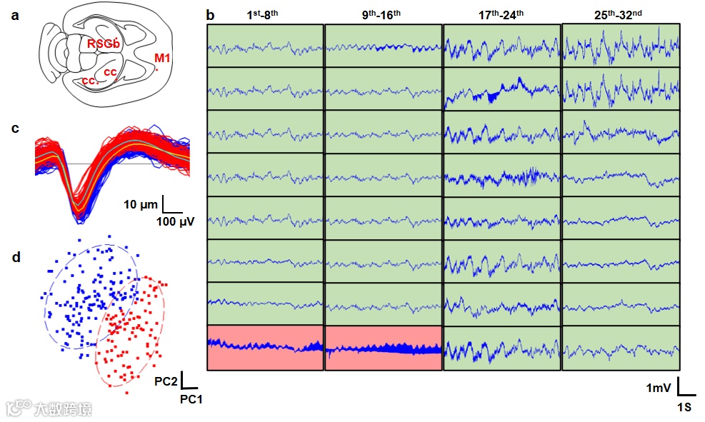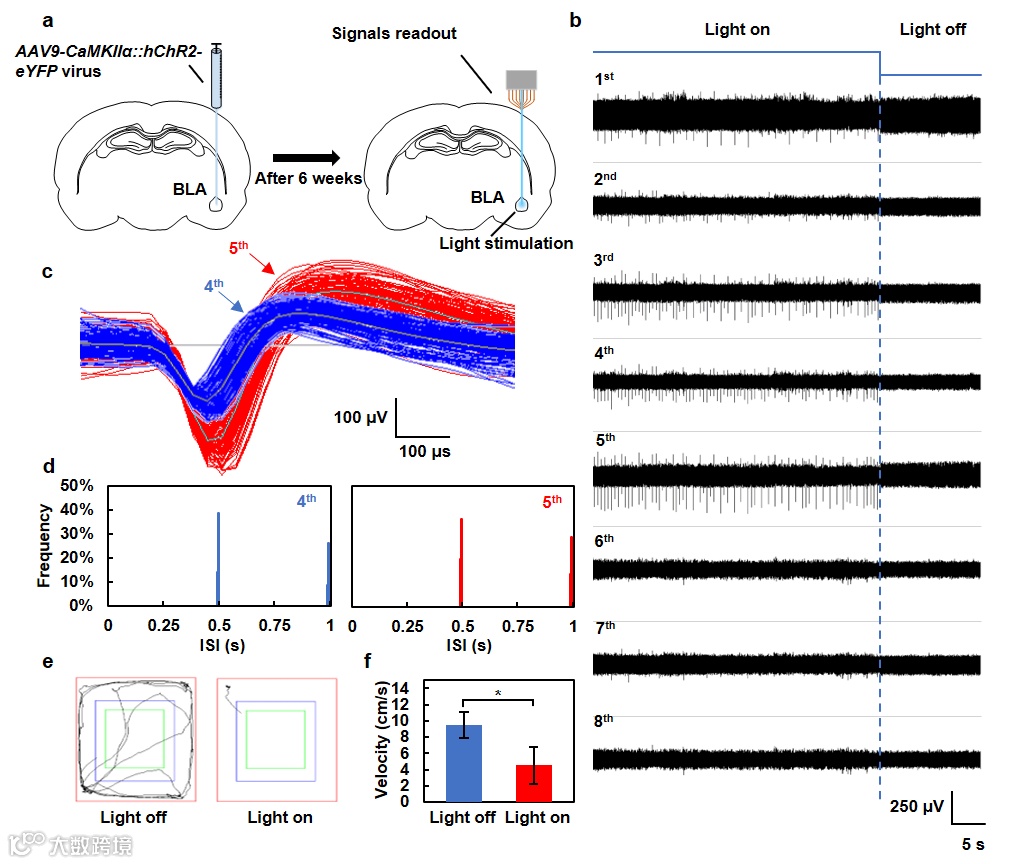 研究团队对该器件的光学、电学等方面性能进行了体外的表征测试,并将该器件植入麻醉大鼠的四个脑区中(图2a)。该器件的32个通道能够在不同脑区中同时记录局部场电位和动作电位等电生理信号(图2b-d),实验证明可以探测到67μV的微弱自发动作电位(图2c),并且对来自不同细胞的放电进行区分(图2d)。
