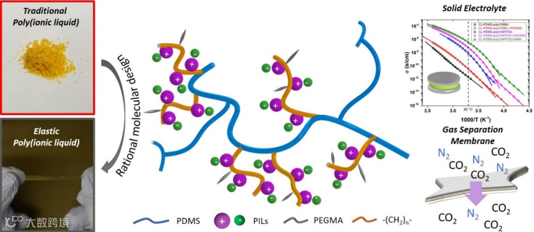 许多功能聚合物材料在常温条件下缺乏延展性。使这些材料具有弹性和柔韧性是一项具有挑战性的工作,此类工作对于包括柔性电子器件,分离膜在内的广泛应用中尤其有意义。聚离子液体(PILs),例如基于乙烯基咪唑鎓的聚合物,在固态、凝胶态电解质和离子导电膜等领域有较为广泛的应用,然而此类聚合物在常温条件下因其处于“玻璃态”故具有脆性,此种性质极大地限制了此类聚合物在可拉伸器件,柔性分离膜等领域的应用。